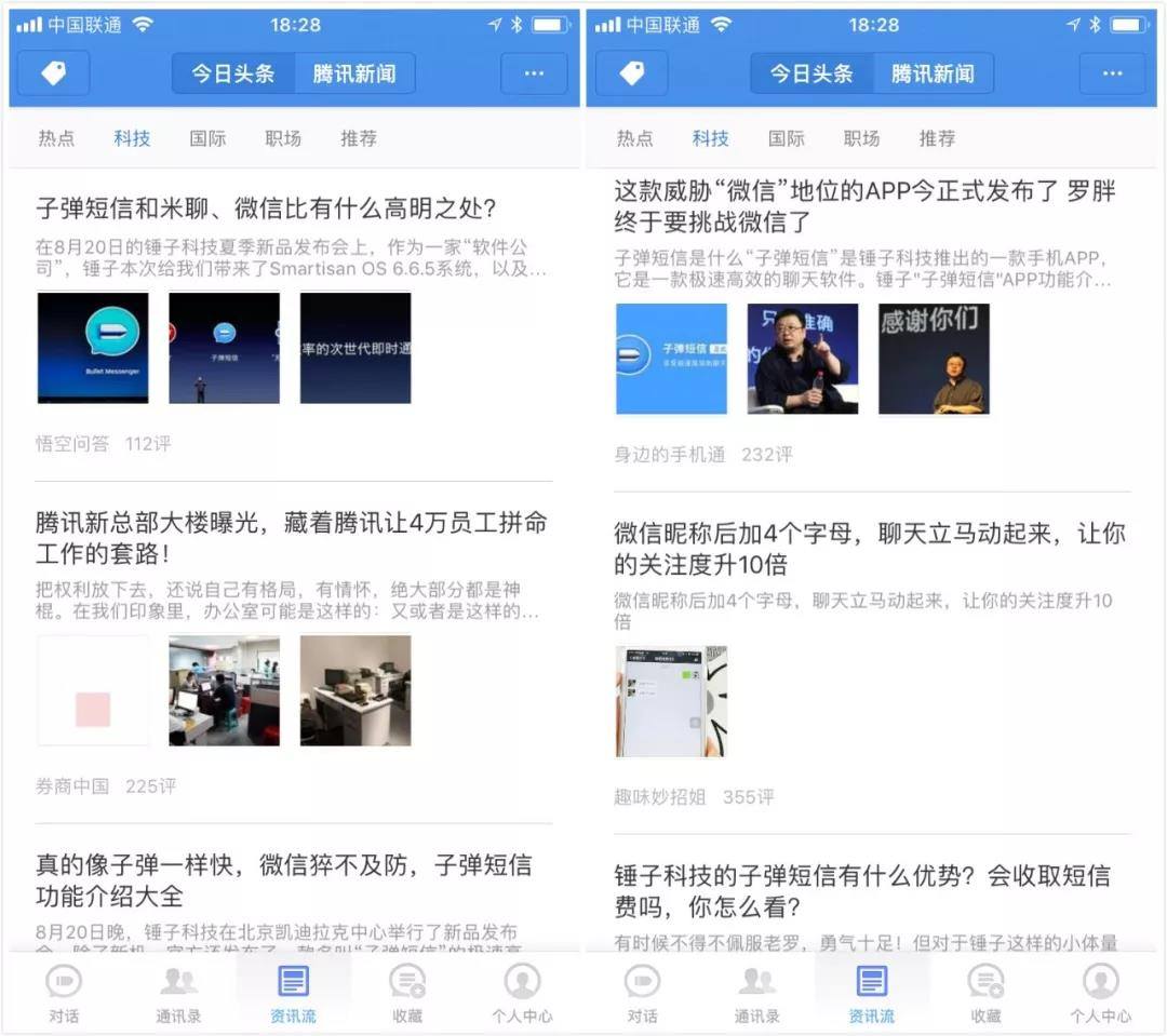 首先,子弹短信的资讯功能,确实很新颖。不过按照实际的体验来看,或许是准备不足的原因,子弹短信的资讯内容大多数都是跟锤子相关的文章,内容的丰富度与实际的今日头条和腾讯新闻根本不是一个层次。