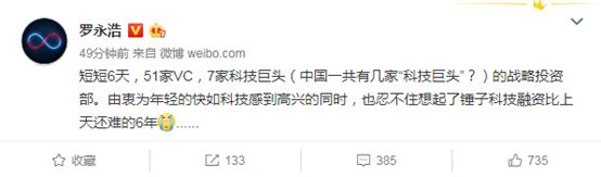 锤子科技CEO罗永浩今日发布微博称:“短短6天,51家VC,7家科技巨头(中国一共有几家‘科技巨头’?)的战略投资部。由衷为年轻的快如科技感到高兴的同时,也忍不住想起了锤子科技融资比上天还难的6年...... ”
