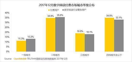 2017年12月数字阅读付费三线和四线城市的付费比例均高于整体比例。而一线二线低于整体比例。