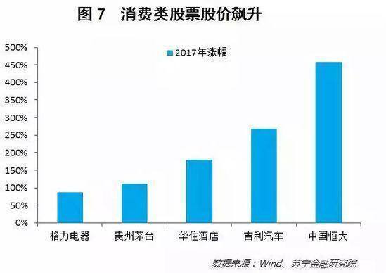 2017年如下的消费类股票飞涨。尤其是贵州茅台。飞天茅台在狗年到来之际,又涨了200元一瓶,依然难当脱销之势。为什么?对应的是资产膨胀的获利者的消费兑现。他们的酒桌上多了更多的茅台;得益于改善型住房需求,电器的消费亦非常强劲(体现为去年白色家电股票飞升,但今年下半年的股市表现已经彻底脱离业务面,无法参考)