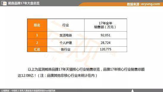 根据云观数据,2017年,仅天猫渠道,戴森各产品线销售额总额已达到12.08亿元。