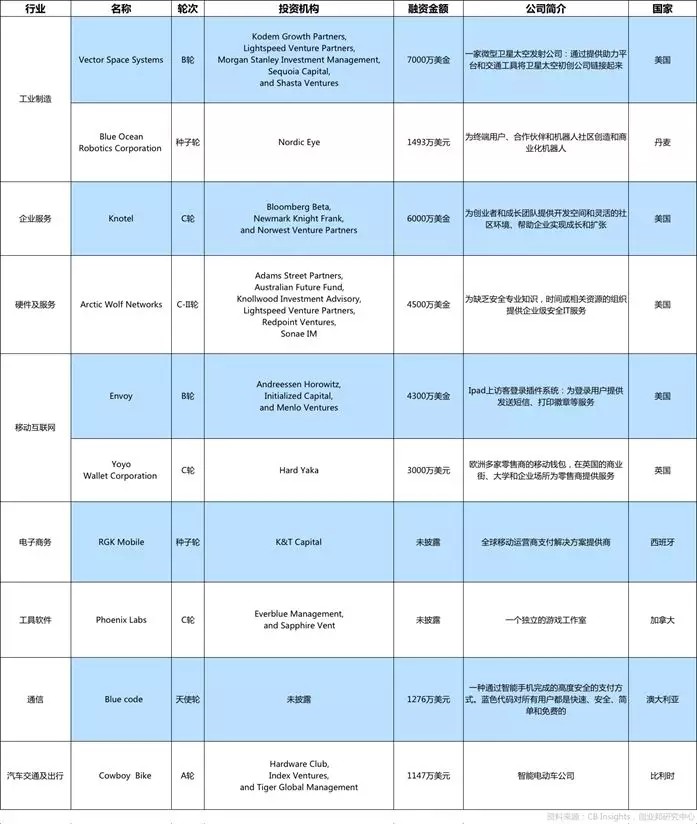 本周监测国外融资事件共计215起,以下从行业分布、融资阶段、融资规模方面进行具体分析。