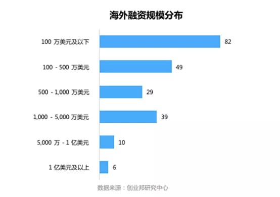 本周国外融资事件的融资规模主要集中在100万美元及以下,共82起。融资额达1亿美元以上的案例有6起。