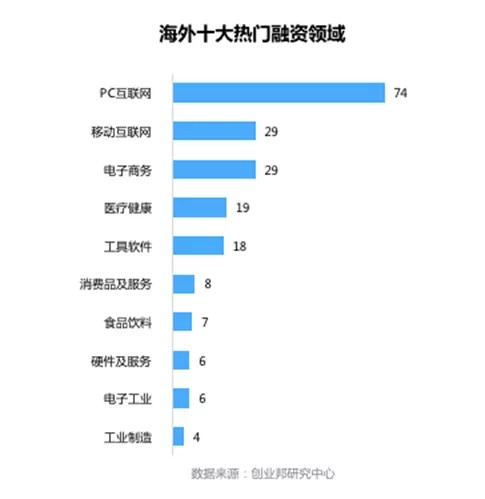 本周披露国外融资事件涉及15个行业领域,其中融资案例数最多的五大行业分别是PC互联网74起,电子商务、移动互联网并列29起,医疗健康19起,工具软件18起。