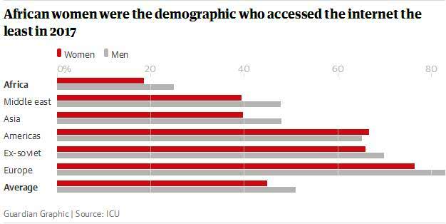 还有严重的性别差异:在世界上三分之二的国家,男性主宰着互联网的使用。在全球范围内,女性网民数量比男性少12%。虽然自2013年以来,大多数地区的数字性别差距缩小了,但在非洲却扩大了。国际电信联盟说,在那里使用互联网的女性比男性少25%。