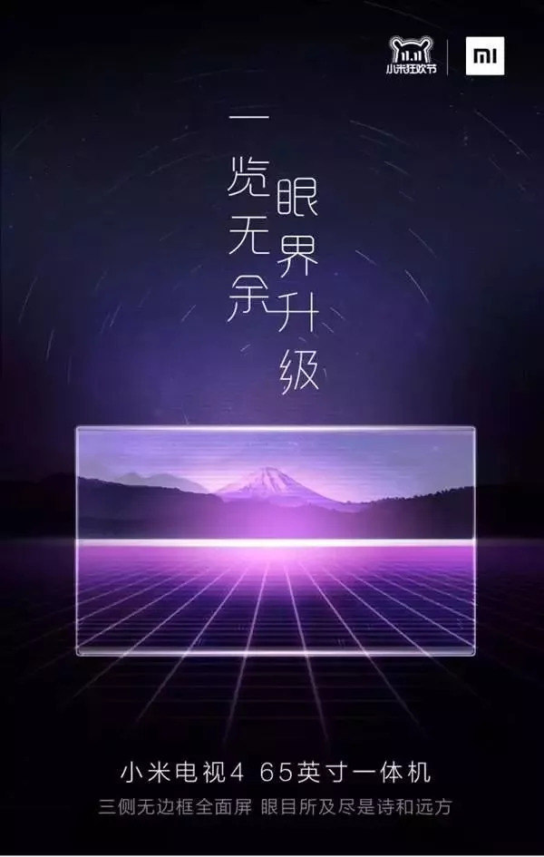 最近,小米官方公布了小米电视4 65英寸一体机的新品信息,这款产品主打“一览无余,眼界升级。”的概念,如果没有意外的话,应会在11月6日下午正式发布。目前官方并没有给出这款产品的参数信息,不过从海报上可以看出部分内容,该电视采用65英寸设计,采用超窄边设计,屏幕占比应该会比较高。