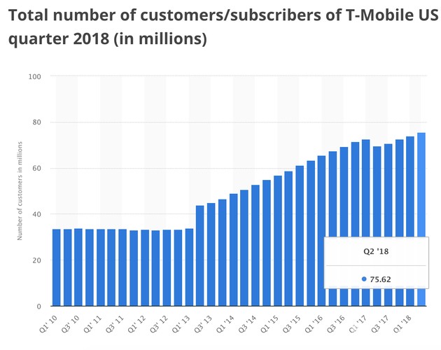 得益于激进的价格战(大幅下调价格,提供无限套餐,为携号转网用户支付毁约金等手段),T-Mobile的用户数从2013年第二季度开始急剧增长,从上一季度的3390万人骤然提升到4400万人。在随后的五年时间,T-Mobile的用户基数一路增长到今年第二季度的7562万人,一举超过Sprint成为美国第三大运营商,并对Verizon和AT&T这传统两强构成了实质性威胁。