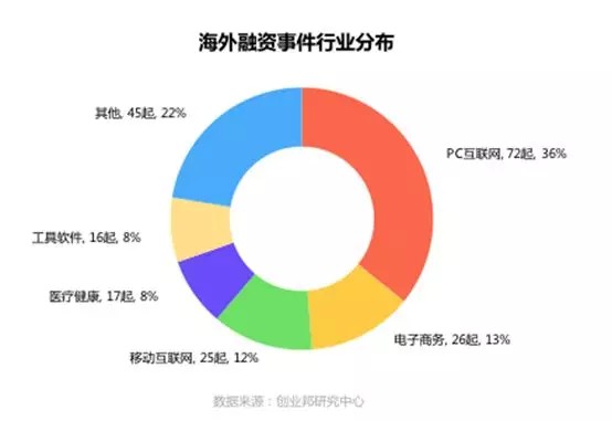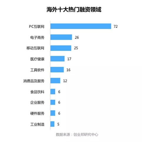 本周披露国外融资事件涉及15个行业领域,其中融资案例数最多的五大行业分别是PC互联网72起,电子商务26起,移动互联网25起,医疗健康17起,工具软件16起。