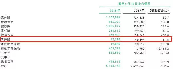 众安在线2018年中报显示,2018年上半年货运险较2017年同期增速仍高达64.6%,显示其运费险收入仍在高速增长。