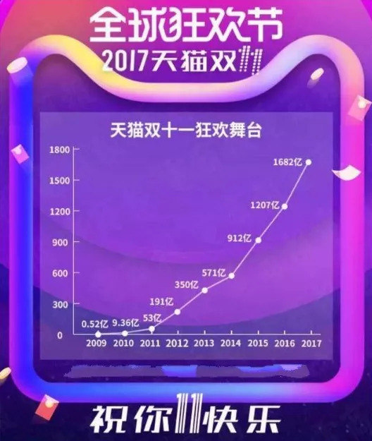 从2013年的350亿,2014 年571亿,2015年912亿,到2016年的1207亿,阿里双11购物节的销售额疯狂增长。看着今年这个速度,突破2017年的1682亿惊人数据不是难事。