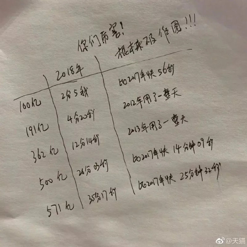 4分20秒,总成交额超191亿元,已超2012年天猫双11全天的成交额12分14秒,冲到362亿元,已超过2013年双11全天的成交额,26分03秒,突破500亿!!
