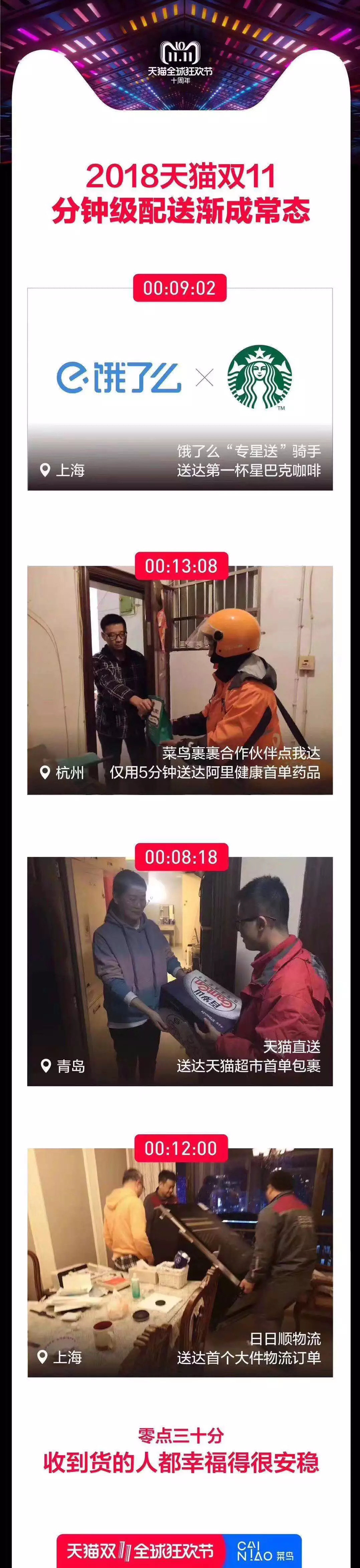 此外,为确保天猫双11期间蜂鸟物流的运力,饿了么蜂鸟配送提前招募储备新骑手保障运力,做足了夜间配送保障。