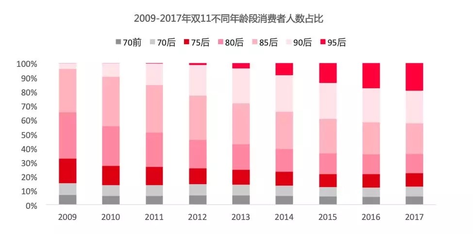 报告显示,每一代年轻人都是天猫双11最踊跃的参与者。2009年参与双11的主体消费者是80后,占比超过6成,此后,90后消费者占比逐年增长,2015年之后,90后用户的占比就已经超过80后,成为最主要的线上消费群体。到了2017年,95后消费者的占比已经接近2成。