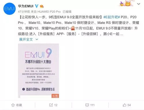 华为官方表示,11月10日将进行不限量EMUI 9.0升级,共有9款机型支持该系统。华为P20、P20 Pro 、 Mate10、Mate10 Pro、Mate10保时捷设计、Mate RS 保时捷设计、荣耀10、荣耀V10、荣耀Play的用户可以于9点后进行升级。