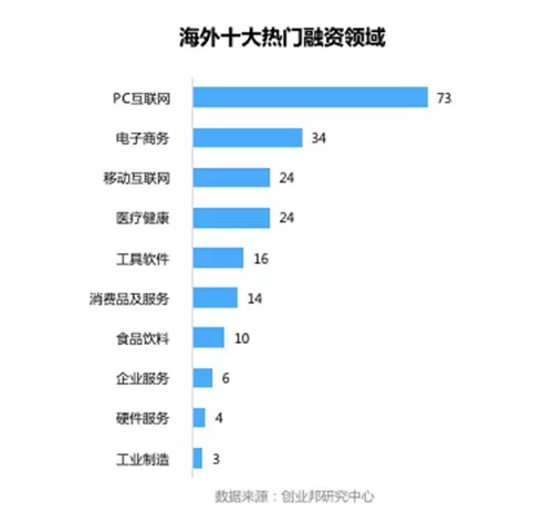 本周披露国外融资事件涉及17个行业领域,其中融资案例数最多的五大行业分别是PC互联网73起,电子商务34起,移动互联网、医疗健康各24起,工具软件16起。