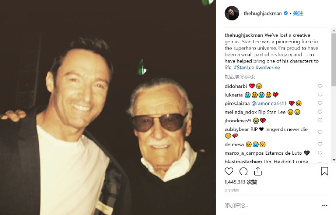 “金刚狼”休·杰克曼:我们失去了一个天才,他是超级英雄宇宙的先去力量,我非常骄傲能成为他传奇的一部分,使他得的一个漫画人物成为现实。