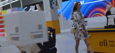 韩国一家名为E-Mart的连锁超市推出了一款智能跟随式购物车eli。这款购物车可以充当导购的角色,你可以在它的显示屏上查找想要购买的商品,然后它就会带着你直奔目的地;eli还具备收银功能,当你把商品放入购物车后,它会自动识别条形码并显示出已选商品的价格总和,之后顾客可以直接手机结算支付;同时超市还允许 eli 跟随顾客行驶至停车场。等到顾客将所有商品带走后它才会自动返回到充电站。