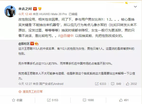 微博CEO回复王思聪抽奖活动质疑:重点不在于性别