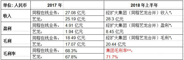 聆讯后更新资料集显示,2018年上半年(截至6月30日),同程及艺龙总营收为 28.3 亿元人民币,毛利 20.44 亿元人民币,集团毛利率达71.7%。上半年,同程及艺龙总计实现盈利 8.45 亿元,超过同程及艺龙2017年全年6.86 亿元的盈利水平。