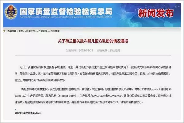 2018年3月,荷兰发布快速预警通报,某洋品牌奶粉受到阪崎肠杆菌污染后被销往中国、英国、越南等地。由于阪崎肠杆菌会引发婴儿重症,死亡率高达50%,顿时引发恐慌。好在国家质检总局及时出手,将污染奶粉成功阻截,否则后果不堪设想。
