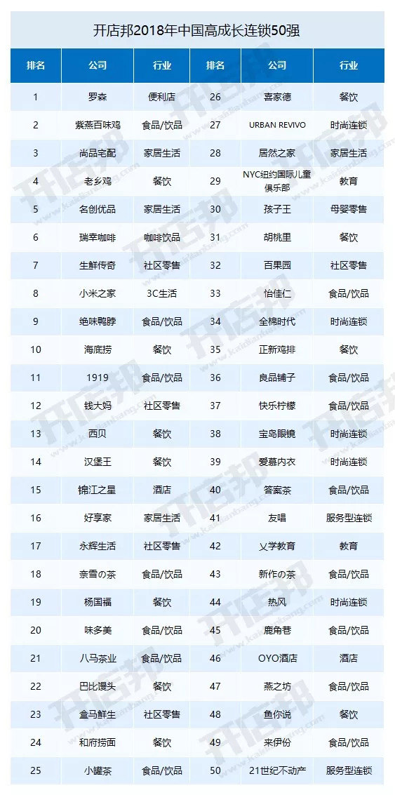 11月9日晚,开店邦“2018年中国高成长连锁50强”榜单正式出炉,从2008年至今已经是第十一届了。