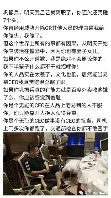 “巩振兵曾用威胁开除GR其他人员的理由逼自己给他磕头,甚至连磕了7个头。”
