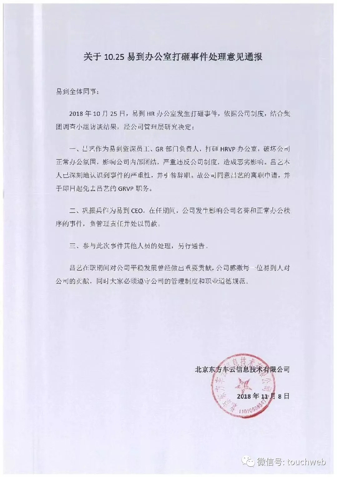 易到11月8日发布了一份《关于10.25易到办公室打砸事件处理意见通报》。该通报称,吕艺认识到事件的严重性,已要求引咎辞职并获得公司同意。