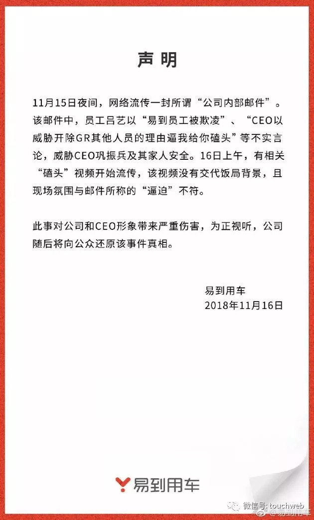 易到官方随后发表声明称,网上流传的“磕头”视频,没有交代饭局背景,且现场氛围与邮件所称的“逼迫”不符。
