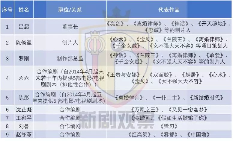 除了上述股东外,新丽传媒还通过协议的方式,绑定了包括导演刘惠宁、宋晓飞、简洵钊、刘进、陈玉珊等知名导演,申捷、马伯庸、流潋紫等知名编剧。