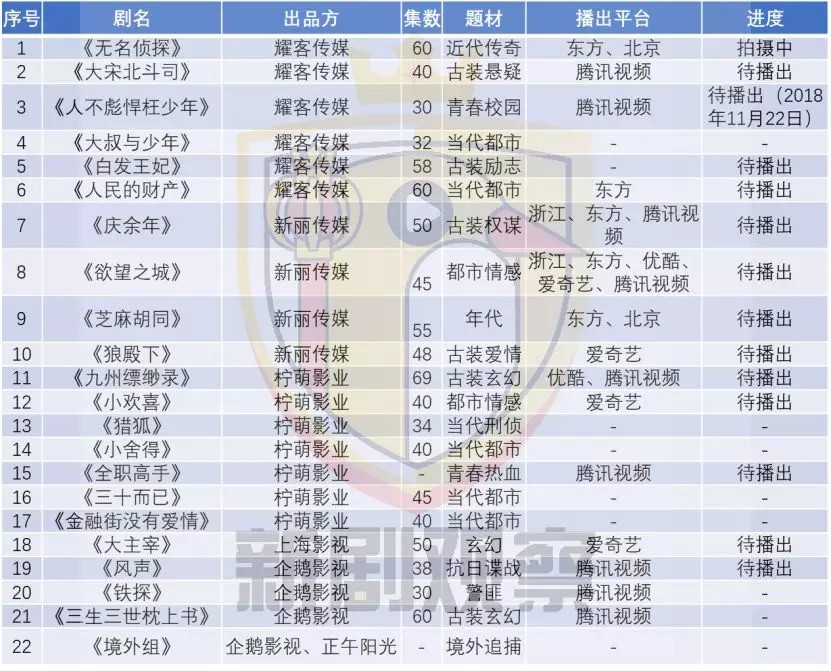 《庆余年》为东方卫视、北京卫视的年度招商大剧,《铁探》和《三生三世枕上书》为企鹅影视主控项目,也是毫无悬念的为腾讯视频独播剧。