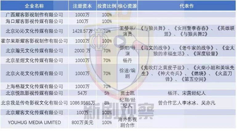 除此之外,耀客传媒还通过与包括导演、编剧、演员、经纪人在内的产业资源共同设立或投资公司来实现更广泛的资源捆绑。