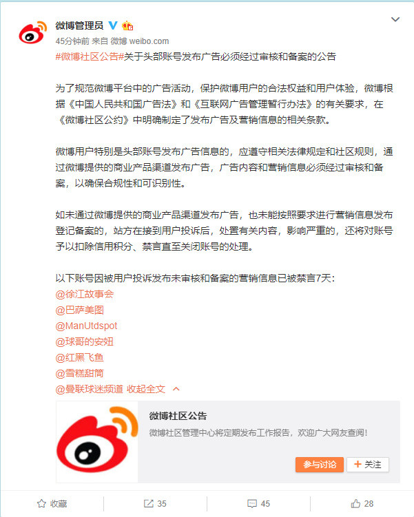 微博官方账号@微博管理员发布公告表示,微博用户特别是头部账号发布广告信息的,应遵守相关法律规定和社区规则,通过微博提供的商业产品渠道发布广告,广告内容和营销信息必须经过审核和备案,以确保合规性和可识别性。