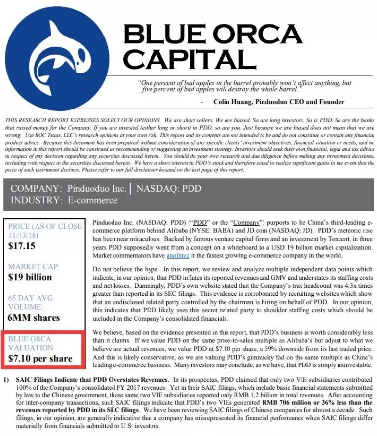 之前因为做空新秀丽而成名的空头机构Blue Orca发布了做空报告,认为拼多多每股只值7.1美元,(这相比拼多多上一个交易日低了59%)而这个估值还算保守,在认清其真面目后,拼多多根本就不值得投资。