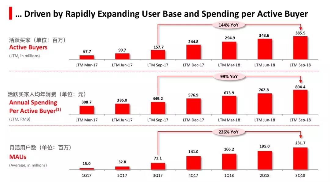 用户数据上,拼多多三季度月活用户增至2.31亿,同比大增225%,环比增加18%。而拼多多三季度为止的12个月活跃买家为3.86亿,同比增加144%,环比增加12%。