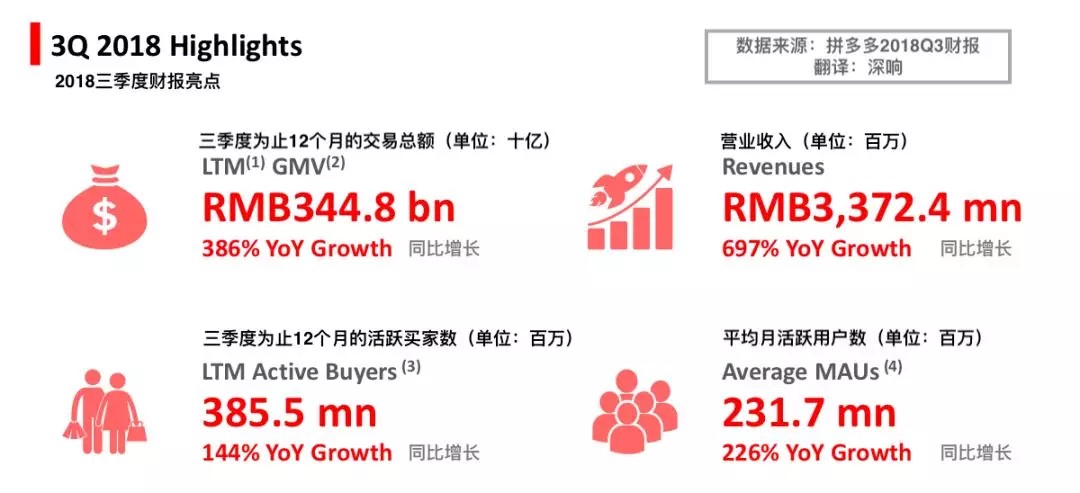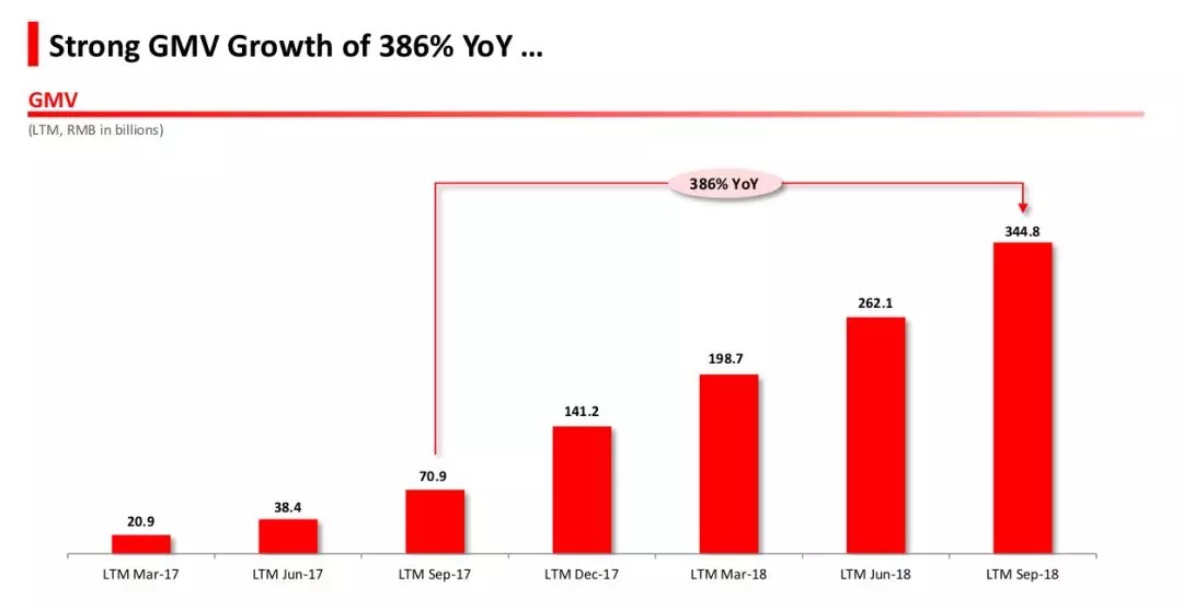 作为电商行业的重要指标,拼多多的GMV增速远超预期。虽然没有公布单个季度的GMV,但是在截至2018年9月30日的12个月期间,拼多多GMV交易额达3448亿元,同比增长386%,是电商行业平均增速的15倍。