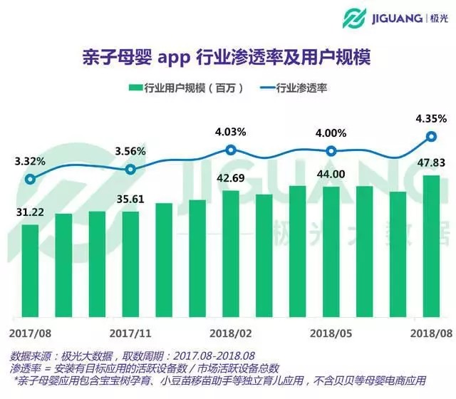从极光大数据的“亲子母婴App的行业渗透率”统计来分析:从2017年8月到2018年8月,整个行业始终呈现震荡上升走势。目前亲子母婴App的行业渗透率为4.35%,整体用户规模达到4,783万,较去年同期增长53.2%。虽然中间有波动,但整体向上的趋势十分明显。