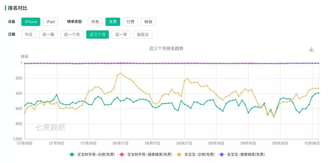 虽然只是一字之差,但是这个定位在家庭育儿移动互联网平台的App却呈现出很快的增势,尤其是进入今年暑期之后。数据显示从7月25日开始,亲宝宝在iOS的总榜排行已经连续三个月超越宝宝树(2018年7月-2018年10月)。