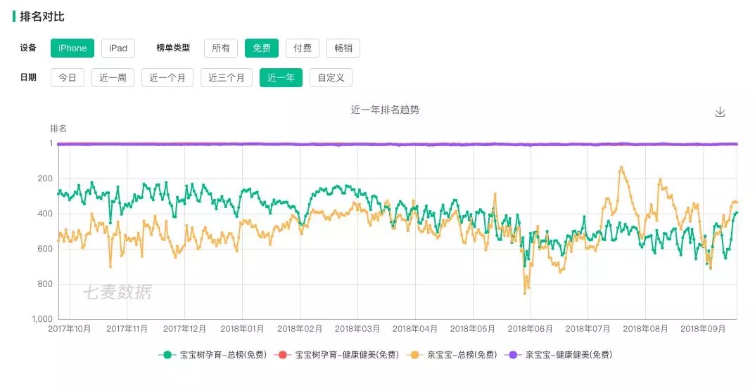 而在一些具体的移动端应用市场,亲宝宝作为后起之秀明显与老将宝宝树距离相近甚至超出。根据七麦数据显示,近一年iOS用户数量排名显示,宝宝树整体有下行趋势,而在2013年上线的App应用“亲宝宝”则呈现稳中有升的态势。尤其是从2018年3月中旬开始,亲宝宝的数据走势就开始逐渐追平宝宝树,并在2018年7月上旬开始明显超越后者。
