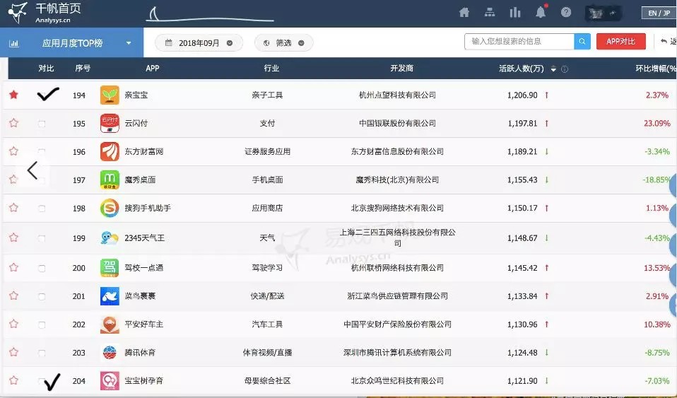 易观千帆指数“APP月度TOP榜”显示,今年9月份,亲宝宝APP排名第194名,而宝宝树孕育居后,排204名。9月份,亲宝宝月活跃人数已超过宝宝树85万。