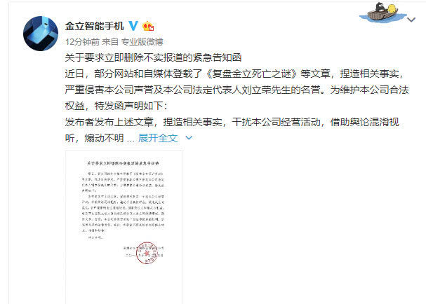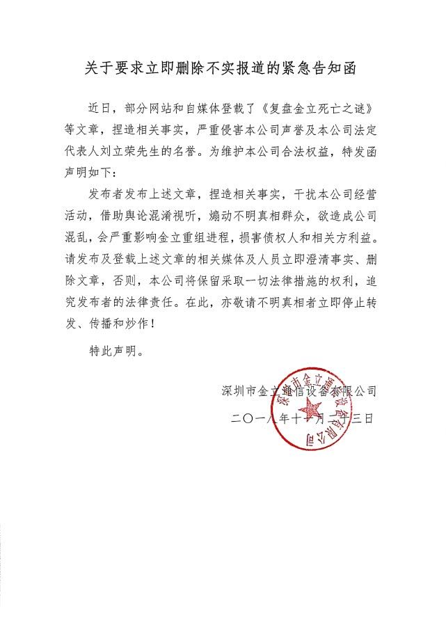 金立在声明中表示,发布者发布上述文章,捏造相关事实,严重侵害公司声誉及法定代表人刘立荣显示的名誉,干扰本公司经营活动,借助舆论混淆视听,煽动不明真相群众,欲造成公司混乱,会严重影响金立重组进程,损害债权人和相关方 利益,要求发布及登载文章的相关媒体立即澄清事实、删除相关文章。