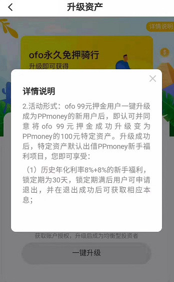 11月23日下午消息,ofo今日在App里发布通知称,ofo 99元押金用户一键升级成为PPmoney的新用户后,可实现永久免押金骑行。今年6月,ofo取消了与芝麻信用合作的信用免押金政策,ofo方面当时回应称,这并不是意味着变向取消免押金服务,是在尝试建立自己的信用体系。在退还押金的过程中,出现押金转入网贷平台的提示。“正常的市场活动,用户可以根据自己的需求进行选择,”ofo表示,如果选择正常退款,仍然会走正常流程进行,时间为15个工作日。