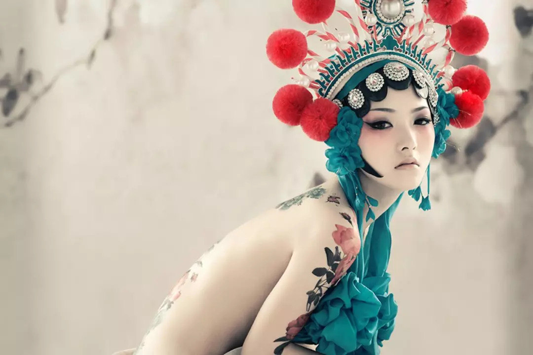 在另一个爆款“释灵”主题的客片中,女性戴着京剧头面半裸上身,十分大胆。在杨健眼中,这是最为经典的盘子代表作,“以国粹京韵的妆面造型,体现中国时尚。”