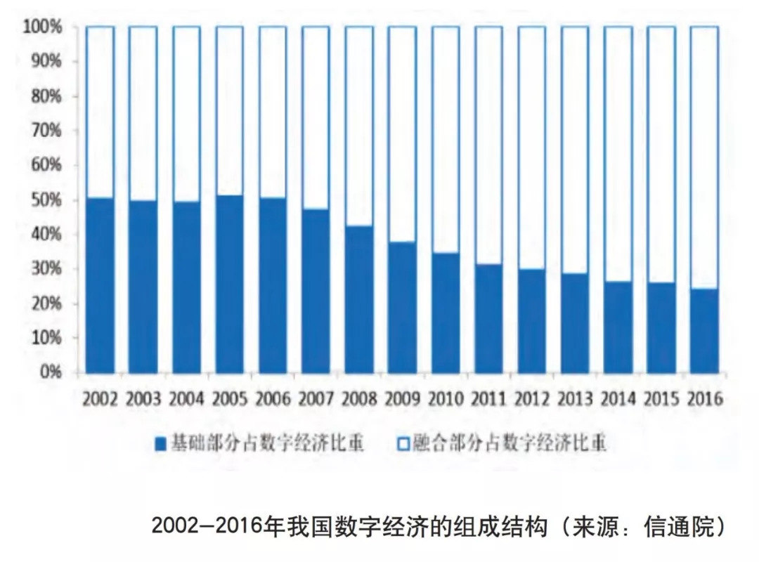 “数字经济界”近几年形成了一个共识,既数字经济的本质是融合经济,实体经济是其中重要的一环。中国信通院的测算结果表明,数字经济融合部分占比不断提升,2016年达到76%。融合部分日益成为数字经济的主体。