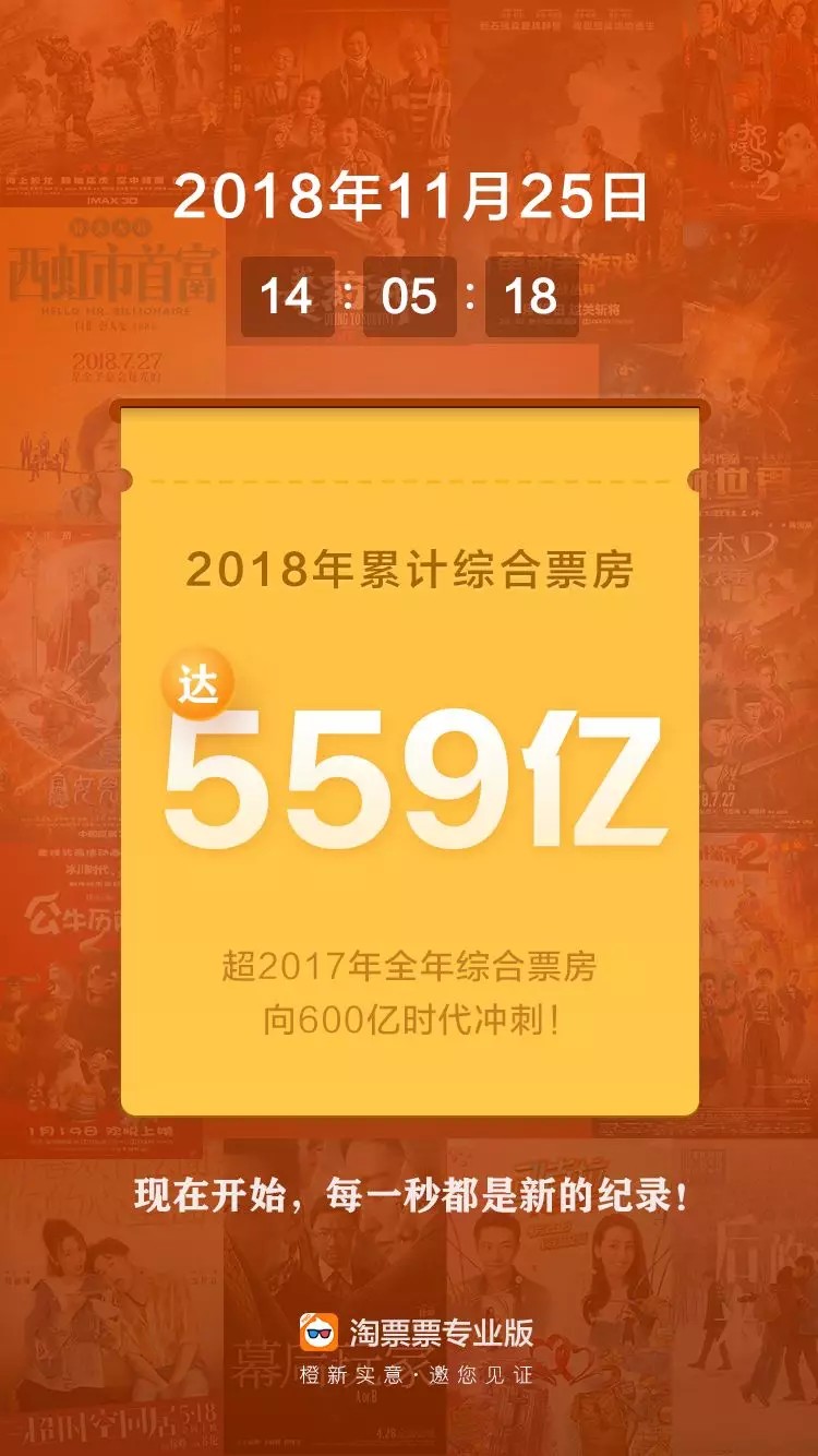 11月25日14点05分,根据淘票票专业版数据显示,中国2018年累计综合票房已达559亿元人民币。随后,国家电影局证实,截至11月25日17点27分,2018年全国总票房已经超过2017年总票房559.11亿元,创下新纪录。
