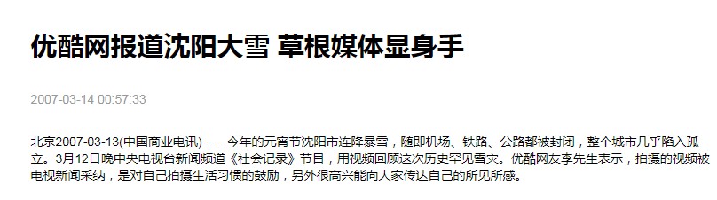 2007年3月,网友将沈阳大雪的视频传到网上,带火了一个网站,优酷,当时的媒体标题还是“草根媒体显身手”。优酷是众多起跑者中来得比较晚的,创始人同样来自“视频网站创业的黄埔军校”搜狐。不少评论认为,它正式运营的时间受了谷歌16.5亿美金收购youtube很大影响,收购事件发生于2006年11月,一个多月后,优酷正式开始运营。