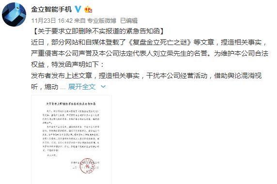金立官方在当天发布声明称,文章捏造相关事实,会严重影响金立重组进程。声明要求媒体删除文章,否则将保留采取一切法律措施的权利,追究发布者的法律责任。