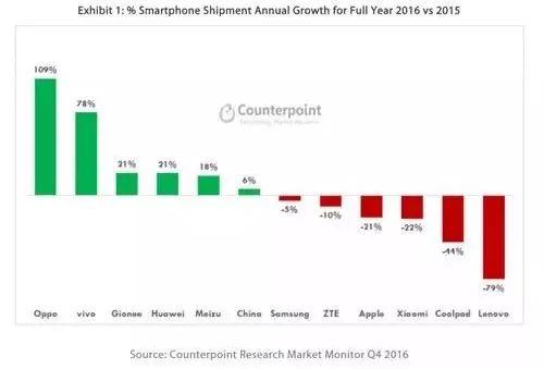 即使在智能机时代,金立也没有落后。根据市场调研机构Counterpoint发布的2016年全球智能手机销量报告,金立的销量增长率达到21%,与华为分别位列第三与第四的位置。当时有部分从业者表示,金立或许有希望冲击华米OV阵营。