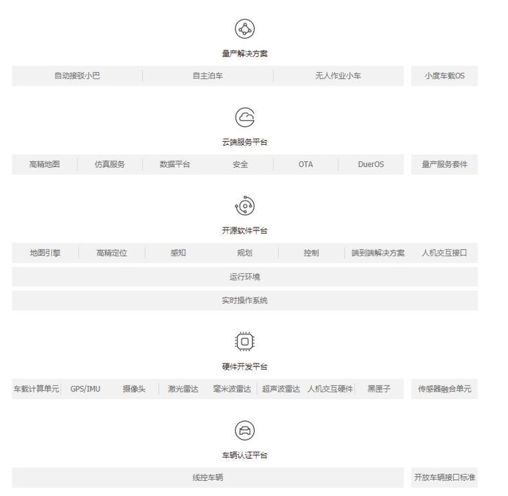 据平台显示,Apollo平台包含量产解决方案、云端服务平台、开源软件平台、硬件开发平台、车辆认证平台五大模块,涉及自主泊车、车联网小度车载OS、感知、高精度地图、仿真平台、OTA等30余个独立产品。