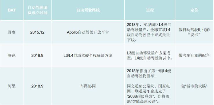 经历了多领域布局,BAT自动驾驶路线已成型,汽车产业链上各家的角色已敲定:百度注重打造自动驾驶平台,腾讯则面向L3/L4的全栈解决方案,阿里偏重车路协同。这也是当下面向未来交通赛道上的三大主流路线。