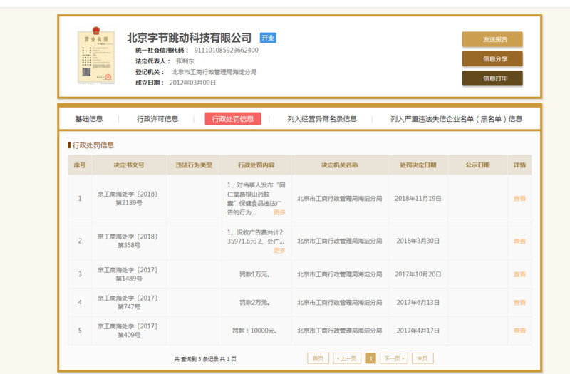 日前根据国家企业信用信息公示系统显示,北京字节跳动科技有限公司旗下“今日头条”软件在未取得医疗广告审查证明的情况下发布医疗广告,违反了《广告法》第四十六条规定。国家企业信用信息公示系统另显示,在2018年11月19日,对今日头条违法发布同仁堂保健食品广告以及非处方药非法广告,共计罚款300万元。